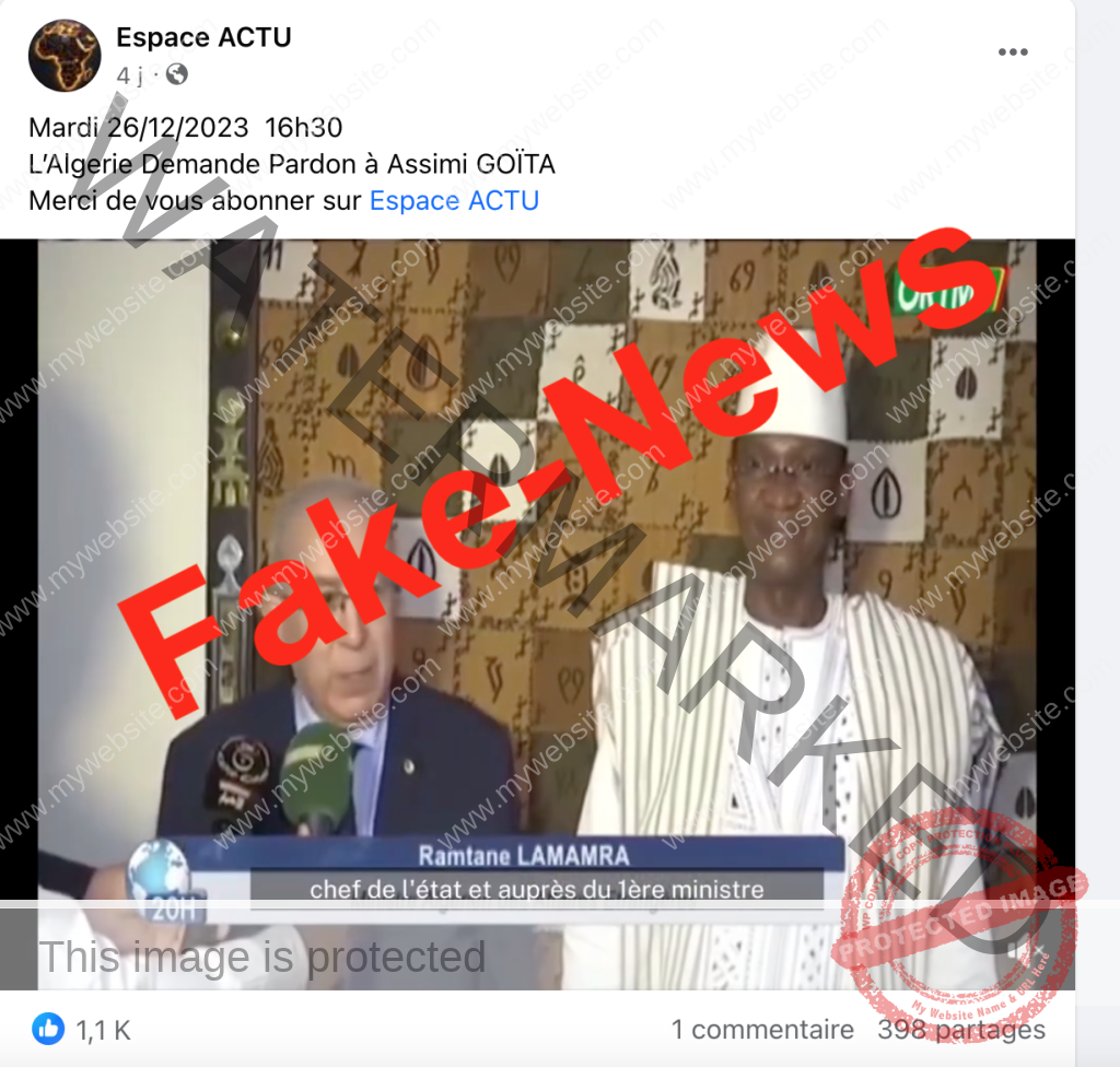 La légende accompagnant cette vidéo de l’ancien ministre des Affaires étrangères d’Algérie au Mali affirme : « L’Algérie vient demander pardon au président, à son gouvernement et aux peuples maliens ». Dans cette séquence, le diplomate algérien exprime le soutien de l’Algérie au peuple malien. Cette vidéo, qui ressemble à une production de l’ORTM en raison de la présence de son logo, ainsi que du logo du journal de 20H, montre aux côtés du ministre algérien, le Premier ministre malien Choguel Kokalla Maiga. Cette vidéo est devenue virale sur les réseaux sociaux, notamment sur TikTok et Facebook (1,2,).