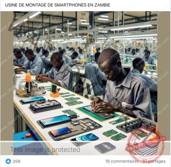 Sous la légende « LA ZAMBIE, Une industrie de montage de smartphones ! », cette image a circulé abondamment sur Facebook, partagée sur plusieurs pages (1, 2, 3) depuis novembre 2023.