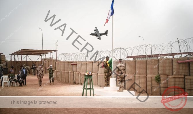 Un avion C-130 Hercules survole le camp militaire de Barkhane lors de la cérémonie de changement de drapeau à Tombouctou le 14 décembre 2021, lors de la passation du camp français à l'armée malienne. (Photo, AFP)