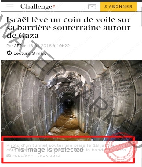 Entre la 19e et la 21e seconde de la vidéo, une photo du tunnel présumé est affichée. Après une recherche d’image inversée, l’origine de cette séquence a été retrouvée. La photo en question, datant du 18 janvier 2018, a été prise du côté israélien de la frontière avec la bande de Gaza. Elle a été capturée par Jack Guez pour l’Agence France Presse (AFP). Ces détails ont été confirmés par le compte ayant utilisé cette photo à des fins d’illustration, tout comme d’autres comptes l’ont fait pour accompagner leurs articles sur le sujet des tunnels.