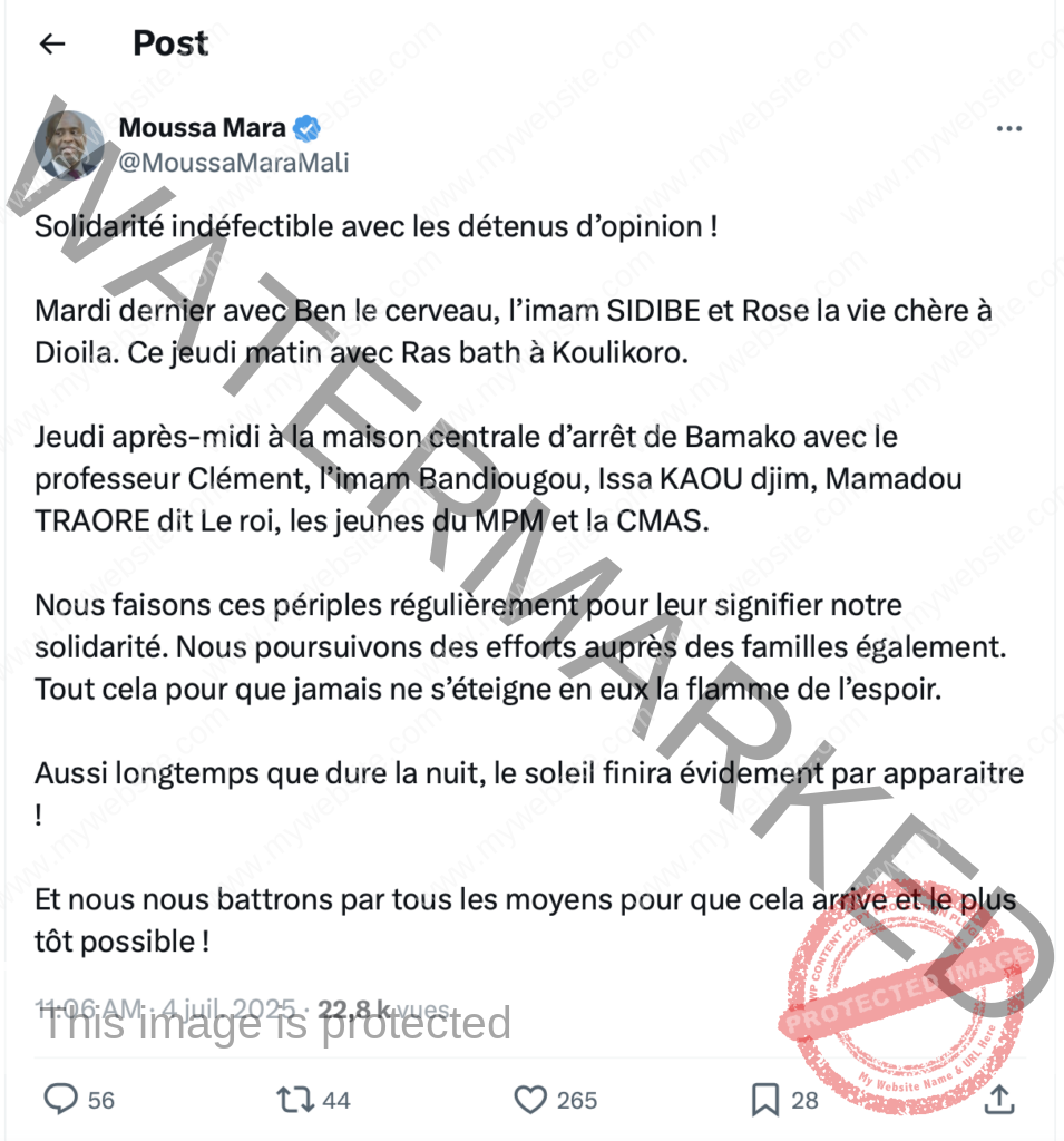 Le 1ᵉʳ août 2025, l’ancien Premier ministre malien Moussa Mara a été placé sous mandat de dépôt à Bamako. En cause : un message publié un mois plus tôt sur le réseau social X (anciennement Twitter), dans lequel il affirmait, après avoir rendu visite à plusieurs détenus d’opinion : « Aussi longtemps que dure la nuit, le soleil finira évidemment par apparaître ! Et nous nous battrons par tous les moyens pour que cela arrive et le plus tôt possible ! » Un propos jugé subversif par le parquet du Pôle national de lutte contre la cybercriminalité.