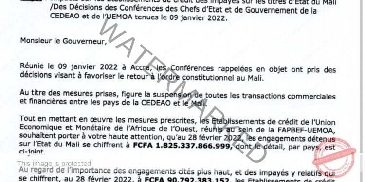 Les mesures drastiques prises contre le Mali par la Conférence des chefs d’État et du gouvernement de la CEDEAO et de l’UEMOA, tenue à Accra au Ghana, en janvier dernier, impactent énormément le marché financier de la sous-région. Ainsi, dans une note adressée au gouverneur de la BCEAO, les Établissements de crédit de l’Union Économique et Monétaire ouest africaine ont attiré l’attention du patron de ladite Institution sur les effets néfastes de ces décisions sous régionales. Parmi ces mesures, figure l’arrêt de toutes les transactions commerciales et financières entre les pays de la CEDEAO et le Mali.