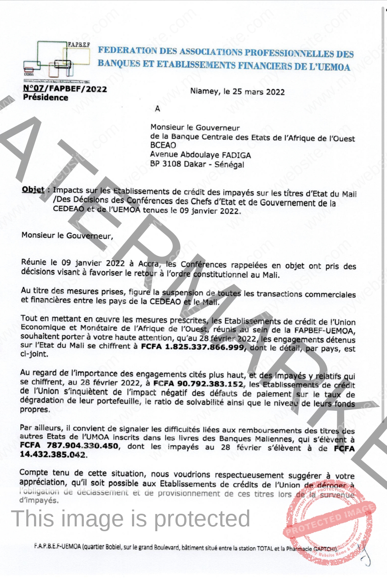 Dans la même note, ces établissements évoquent son inquiétude sur l’impact négatif des défauts de paiement à propos du taux de dégradation de leur portefeuille, le ratio de solvabilité ainsi que le niveau de leur fonds propre. Cela, au regard des impayés du Mali, qui se chiffrent à plus de 90 milliards en date du 28 février 2022.